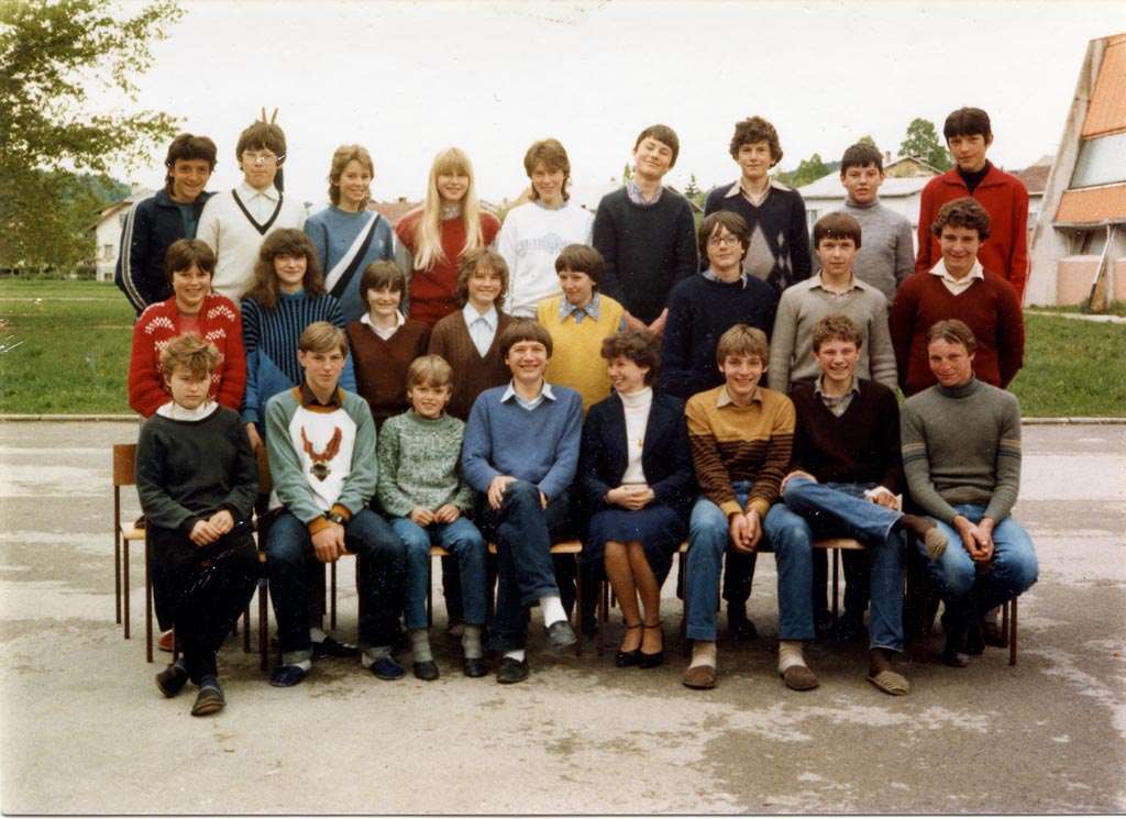 V šolskem letu 1983/84 slikana razredničarka Magda Mele in njen 8. c razred ob osnovni šoli Cerknica.