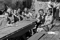 Teh slik nisem se videla. Na sliki sami znani so od spredaj nazaj: Zora Fortuna, druzinska prijateljica iz Trsc, ki pa je po vojni delala in stanovala v Cerknici in sicer je bila snazilka v Konedicevi hisi, kjer je bil zobozdravnik Smrekar. Smrekar se je porocil z Zgoncevo Lojzko in ona je bila potem zobna asistentka. Konec 50. let je sla vsa ekipa v Koper. Smrekar je hitro potem umrl, Lojzka je nedolgo tega umrla. Zora se vedno zivi v Kopru. Ona je bila moja druga mama, pri njej sem prezivela veliko casa.