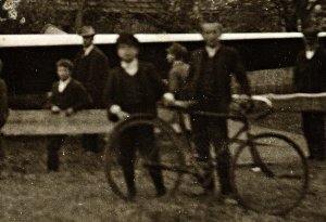 Pri kolesu sta dva fanta. Kolo ima krmilo, kot bi ga v tistih časih ne pričakoval. Kolo je brez prestav, takrat jih še niso iznašli. Oba nosita suknjič in belo srajco.