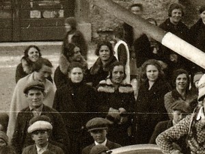 Ob Turšičevi hiši je skupina urejenih gospa skupaj s skupino starejših gospa. Plašč ima le ena, ostale so zavite so v plete in jope. Prav vse so v krilih.Stojijo pred štirno, ki je v tistih časih stala na Placu. Tudi tu so podrobnosti na povečavi dovolj dobre, da lahko občudujemo obleko gospa, ki so se za dogodek uredile. Lahko koga prepoznamo?