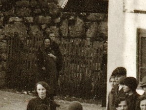 Za Turšičevo hišo se skriva starejša ženska in kuka izza vogala. Najverjetneje je tu nekje doma. Prav daleč na dogodek ni prišla. Poleg nje od daleč spremljata dogodek še dve starejši ženski. Vse tri so pokrite z rutami.Ob obzidju je videti lesen plot.
