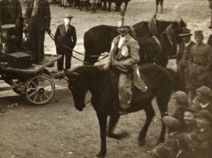 Pred posojilnico je bil celo turek na konju. Konji so očitno nepogrešljivi v pustnem sprevodu že od davno.Za konjenikom z rokami v žepu korači vojak. So bile takrat v Podskrajniku že kasarne?