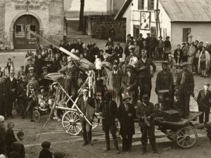Pri povečavi si na fotografiji lahko ogledamo neverjetne podrobnosti, ki jih na razglednici ne opazimo. Sprva mi razglednica ni delovala zanimivo, saj je premajhna, da bi si lahko ogledal, kaj se je dogajalo. Nekaj časa sem mislil, da je to dobrodelna manifestacija, ko so 1915 zabijali žebljičke v model strojnice.  Šele ob podrobnejšem pregledu sem ugotovil, da gre za pustni sprevod.