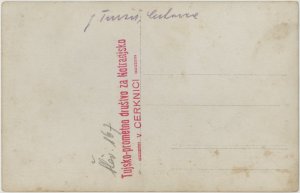 Na zadnji strani je žig Tujsko – prometnega društva za Notranjsko.Poleg tega je napis “g. Turšič Cerknica”. Predvidevam, da je Tujsko prometno društvo zbiralo fotografije za kakšno svojo razstavo ali zbirko in da je to razglednico prispeval Turšič iz Cerknice.
