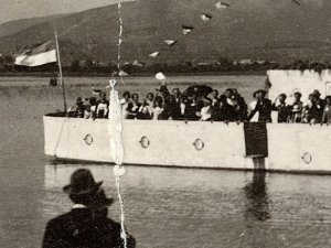 | Z ladjo se je dalo celo peljati. Precej so jo napolnili. Vidimo praznično oblečene potnike, tudi ženske. Komandni most je čisto pravi, pa tudi kapitan je tak, kot mora biti.