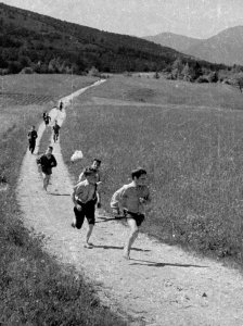 Poleg teka so tekmovanja potekala tudi pred šolo. Vidimo, kako otroci mečejo žogice v prave koše. Starejši šolarji skrbijo za tekmovanje, tovarišica Ludovika Bavdek pa skrbno zapisuje rezultate. Navijačev in gledalcev ni manjkalo. |