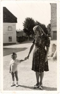 Na fotografiji sta fantek in ženska. Fotografija je priložnostna, fotograf je ujel trenutek.