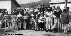 Sprevod maškar se je začel na travniku levo od kulturnega doma. Po cesti smo šli do vage. To leto smo se tam tudi fotografirali.