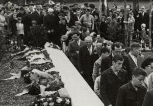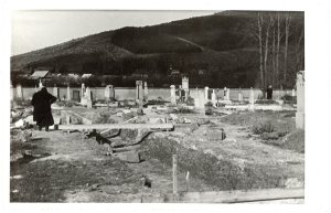 Na fotografiji je pokopališče v času gradnje grobišča. Cerkniško pokopališče je bilo takrat precej drugačno od današnjega. Do danes so vse nagrobnike zamenjali. |