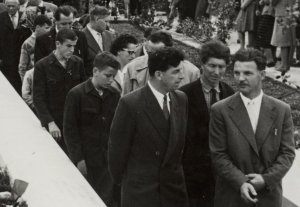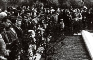 | Fotograf je zabeležil sam akt odkritja spomenika. Častni gost je razkril z zastavo pokrit vhod v spomenik. | |