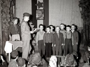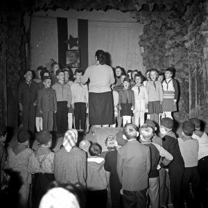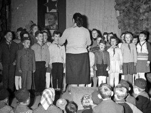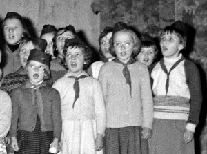 | Izgleda, da je bil pevski zbor sestavljen iz samih prekaljenih pionirjev. Nihče ni doma pozabil rutke ali kape. Iz fotografije je jasno, da je pevski zbor vodila tovarišica Ludovika Bavdek. (drugi z leve v prvi vrsti je Janez Kranjc, poleg njega pa je desno prav lahko njegov brat Žaro).Takrat so bili v Begunjah še vsi razredi, zato je velikost pevcev tako različna. | |