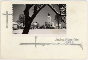 Voščilnica je bila poslana za Novo leto 1962. Na fotografiji je zasnežena cerkev s pokopališčem. Fotografija je slikana s ceste, ki vodi od šole proti Noumu jorku.