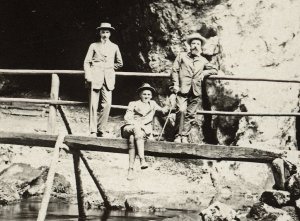 Trije moški so izletniki. Podali so se na nedeljski ogled doline pod malim narvnim mostom. Za današnje poglede so nenavadno oblečeni. Dva sta opremljena s palico, ki so jo takrat verjetno uporabljali za sprehode, danes  takšne za oporo uporabljajo le stari ljudje.