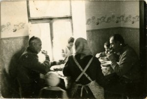 Stari ata, mama Ana, ata Tone, na oknu sedi mlajša hčerka Helena, v kotu za mizo starejša hčerka Anka, s hrbtom proti nam sosedova Marta, ki je pokrita v kapo. Po tem in dolgih rokavih sodeč, ni bilo ravno poletje. Mama Ana je pokrita z ruto, ženske so bile pri jedi lahko pokrite, za moške se to ni spodobilo. Oblečena je v predpasnik, s prekrižanimi širami na hrbtu.