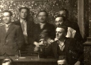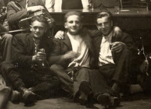 Edini mož s kravato. Za njim je na mizi steklenica sifona in edini možakar s cigareto. Ostali imajo v rokah kozarce. Večina ima srajce zapete do vrha. |