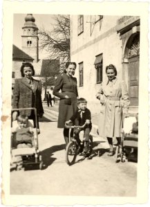 | V pomladnem soncu so se mame srečale na sprehodu. V vozičku je Vojko Harmel, na kolesu pa Andrej Zgonc. Stojijo: gospa Harmel, Amalija Zgonc in Vera Zabukovec. V ozadju, na vogalu današnje knjižnice, je s klobukom še Anton Zgonc.