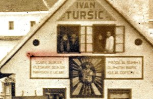 Pred delavnico je je verjetno moj stari oce, ki ga nikoli nisem poznala, saj je umrl 1941. leta. Eno roko drzi v zep in se ne zanima prevec za novice, ki jih je bral obcinski sluga. Vrata delavnice so odprta.
