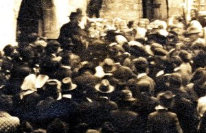 Tako povečana fotografija razkrije marsikatero podrobnost, ki bi drugače ostala skrita. Ženske so pokrite v glavnem v svetle rute, moški pa so pokriti s klobuki. Na desni strani se pokažejo uniformiranci. Zdi se mi, da so uniforme jugoslovanske. Verjetno so žandarji. |