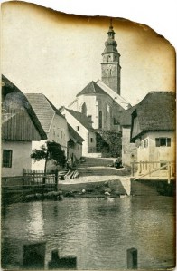 Prikazuje stari del Cerknice s prehodom med Malo in Veliko gaso s cerkvijo v ozadju.