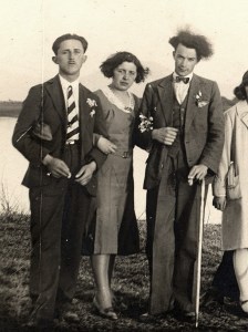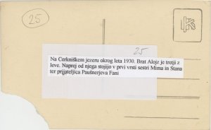 Breda je na zadnjo stran zapisala očetovo pripovedovanje:Na Cerkniškem jezeru okrog leta 1930. Brat Alojz je tretji z leve.