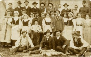 Igralska skupina se je takole postavila pred fotografa. Izjemno so mi všeč oblačila, dodatki in nasploh. Kako imenitno so poskrbeli  za maske! Vse obleke, predpasniki in  rute so nekaj oštikani.
