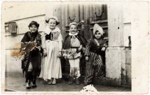 Slika je nastala daljnega leta 1956. Vesele maškare stojijo pred Pogačnikovo hišo na Placu. Z leve proti desni so: Nane in Biba Tekavec, Peter Ribič in Miljana Turšič. Pred Miljaninimi nogami je taleč se kupček snega.