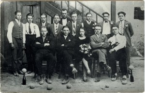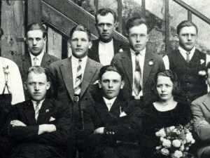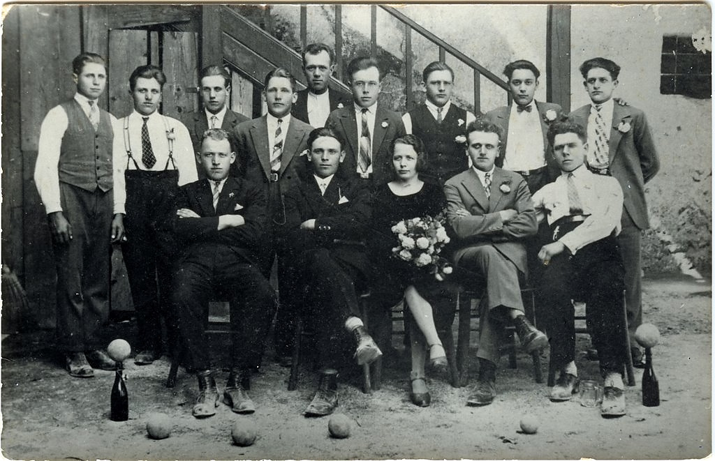Skrajno levo s prekrižanimi rokami sedi Zabukovčev sosed Jože Kebe – Štefetov Jože z Velike gase. |
