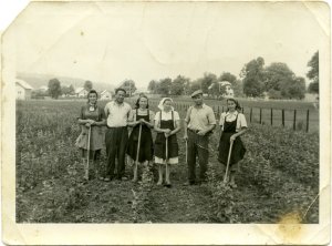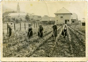 Izgleda, da so delale le ženske, saj imajo le one v rokah motike. Neko orodje drži tudi Tone Caserman. |