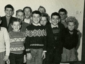 Bili smo v petem razredu v največji učilnici v stari šoli na Veliki gasi v Cerknici. Ta učilnica je bila v prvem nadstropju, nad glavnim vhodom v poslopje. Z učiteljico Sonjo Verbec smo se slikali le fantje. Morda bo katera od sošolk, ki so se tudi slikale poslala svojo sliko? Čakamo. Pred fotografa smo se postavili ob steni nasproti oken, ki gledajo na Veliko gaso.