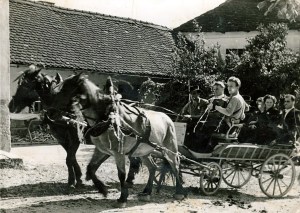 V zapravljivček vprežena, s šoparjem (izg. šwoparjem) okomatana in s pangelci pisanih barv opanglana konja, peljeta, sedaj že moža in ženo in poročni priči, k fotogafu Žnidaršiču – Bajčku in potem domov na Dolenje Jezero.