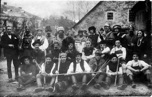 Leta 1925 so nekateri najbolj zagnani sokoli in njihovi podporniki začeli zidati Sokolski dom. Takšen dom so že močno potrebovali, saj so pogosto uprizarjali igre kot so Razvalina življenja, Deseti brat in številne druge. Pri postavitvi doma in v igrah so bile nadvse aktivne tudi sokolice in mlajši sokoli, imenovani deca. Tako so se sokoli ob kulturnem hkrati fizkulturno udejstvovali, saj so družno kopali za temelje doma. Pozimi leta 1928 so delali kulise za oder, vse dotlej pa so vadili in tekmovali kar v Milavcovem skednju. Med igralci so bili humorista France in Janez Turšič, pa odlična igralka Pepina Kralj, Zgonc, Mihevc… France Turšič je celo hodil v Ljubljano na šminkarski tečaj, sicer pa je malo režiral in malo igral. Včasih mu je šminke pomagal prenašati brat Maks. Igralska skupina je slikana pred Milavcovim skednjem, kjer so delali opeko, stari Szopko je delal tam. Skednja že zdavnaj ni več, se pa levo v ozadju vidi današnja občinska stavba in v sredini streha Meletove hiše. Ali je kdo od naštetih na sliki, ne vem. Prav tako mi ni uspelo ugotoviti, za katero igro gre.