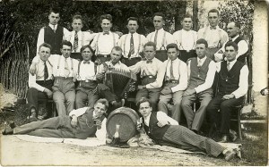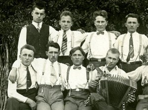 Iz zapisa na hrtni strani fotografije je razvidno, da je bilo v Velikih Blokah leta 1930 12 svatb. Zgodaj spomladi leta 1931 so se fantje zelo lepo, pražnje oblekli in se postavili pred fotografa, da so se poveselili za denar, ki so ga dobili ob porokah. Oblečeni so bili v »lajbelce«, na verižicah so nosili pripete žepne ure, naramnice so držale hlače, okrog vratu pa so si nadeli kravate in metuljčke. Imeli so tudi harmonikaša in poln sod vina.