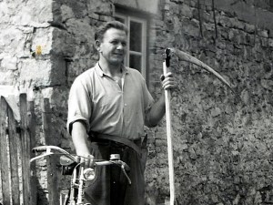 Ivan in France Zabukovec, z nečakinjo Marto na kolesu, se odpravljata kosit za ‘frišno‘. Marta (2,5 leti) in njen bratec Bernard (7 mesecev ) sta bila s svojo mamo na počitnicah pri starih starših. Plenice, ki se sušijo poleg drugega perila na ‘štriku’, so Bernardova last. Ni jih mogel imeti prav veliko, vidni sta le dve. Na počitnice so prišli, ker je bila na obisku sestrična iz Amerike in so tako preživeli nekaj časa skupaj. Ta slika je nastala z njenim fotoaparatom.