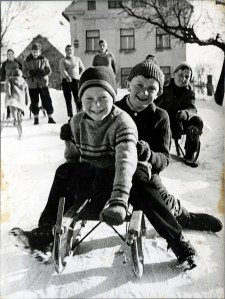 Sankanje samo po sebi ne bi bilo nič posebnega, če se ne bi sankali s Peščenka, izpred Štentove hiše, ki se lepo vidi v ozadju, naravnost na glavno cesto. Ravno prav utrjeno cestišče, ne preveč spluženo in ne preveč zvoženo, je bilo nadvse primerno sankališče. Nasploh je nekoč mularija od blizu in daleč uživala v sankaških radostih na najbolj pripravnih prometnih klancih v kraju, na Mali gasi, na Veliki gasi, Pod kaplanijo in še kje. Če uporabim znane besede še bolj znane slovenske ambasadorke Unicefa, je bilo to v tistih časih, ko “smo otroci še imeli krila”.