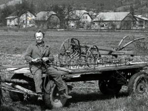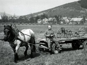 In tako mi je zjutraj vpregel Ridžana, ravno tako sem se usedla, kot ata Janko na sliki, pa sva oddrdarala. Takrat še ni bilo gumarja, čisto navaden tajsəl je bil. Gijo in hout iz Jezera v Cerknico, bistahar čez most, nato hout po Veliki gasi. Na šolsko dvorišče ga je pa  Jože scurikal nazaj.