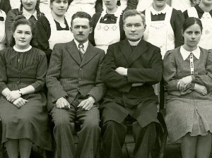 Druga fotografija je bolj svečana. Tečajnice so oblečene v predpasnike in med njimi je takratni župan Kranjc, župnik Turk in učiteljica Drobničeva. Frančiška Košir iz Dobca mi je pokazala vzorno urejene zapiske o tečaju z vsemi jedilnimi listi in recepti.