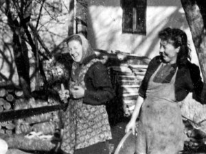 V Podgori je bila navada, da so žagali drva vsak dan pri drugi hiši. Na ta način so si prislužili pomočnike, ko so prišli na vrsto. Pozno popoldan so se dobili pri eni hiši, zrezali nekaj drv in nadaljevali naslednji dan pri drugi. Tako so počasi opravili delo povsod. Francka (srednja na sliki) je povedala, da ni bilo lahko z vsakim ali vsko žagati. Nekateri nikakor niso znali držati žage in je ta “vәdlala” na vse strani. Treba jo je bilo enakomerno vleči k sebi in riniti nazaj. Slika je nastala tik pred zimo, kajti čez poletje ni bilo časa za napravljanje drv. Mnogi so vedno kurili mokra drva in je v peči celo zimo cvrčalo, ko je sok tekel iz njih. Taka drva hiše tudi niso posebej ogrela, topla je bila le krušna peč. Pri njihovi hiši sta bili dve žagi, ena je imela zobe v obliki MUMUMU, ena pa v obliki UUUUUUUU. S kakšno žago so žagali, je bilo odvisno od tega, “kakšnu žagajne” so potrebovali.
