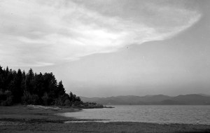 Vreme ni bilo kako lepo, preko jezera vleče veter, ravno toliko, da se hribovje iz ozadja ne odseva na njegovi gladini, ki je rahlo razburkana.