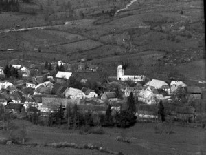 Izsek prikazuje center stare Cerknice s cerkvijo Marijinega rojstva v sredini. Ta cerkev bi brez ponesrečenih dozidav in prezidav zanesljivo spadala med najlepše slovenske dvoranske cerkve. Gre za značilen slovenski tip gotskih cerkva s tremi ladjami enake višine. Grajena je bila hkrati s taborom, dokončana pa v 16. stoletju. Cerkničani so se znali zavarovati proti Turkom. Potem, ko so Turki naselje leta 1472 skupaj s cerkvijo požgali, so tržani v naslednjih desetih letih okoli obnovljene cerkve postavili velik protiturški tabor, pravo mestno utrdbo s petimi stolpi in dvema nizoma zidanih kašč, ki je omogočal zatočišče, nastanitev in oskrbo za 500 do 1.000 ljudi. V ozadju levo od zvonika na njivah je videti Olarjev kozolec in desno od zvonika malo naprej od Nove Kapelice v smeri proti Rakeku Šrangarjev kozolec. Zadaj v desnem oglu stoji Vrdjanov kozolec narejen na psa. |