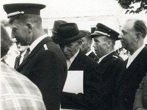 Levi v uniformi cerkniške godbe je Tone Caserman — po domače Ipavč Tone (1912 – 1971). Desno od njega mož v klobuku, ki z levico tišči k sebi bel list, je Casermanov oče. Desno od njega je v godbeni uniformi Matija Mikše — Drašlerjev Matija. Na desni stoji mehanik Toni Mele. Toni Mele je bil rojen leta 1901, umrl pa leta 1959. Po njegovem izgledu sklepam, da je slika nastala tam nekje leta 1954. |