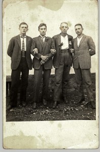 Po zakonu so morali iti na vojaški nabor ali vəstərəngo vsi tisti fantje, ki so dopolnili 21 let. Edini fant na sliki, ki ni okrancljan, je moj stari ata Franc Žnidaršič — Šentek, ki je bil takrat že Posestnik. Z veliko začetnico.