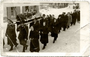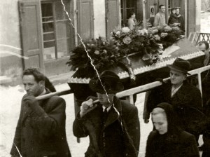 Pogrebni sprevod se pozimi po snežni cesti vije iz farne cerkve v Cerknici preko Placa po Veliki gasi navzdol in nato preko mostu na pokopališče. Na sliki je 10 vencev, ki jih nosijo ženske, kar pomeni, da je umrla ženska in to Terezija Braniselj — rojena Pakiž. Za ženskami, ki nosijo vence, stopata dva duhovnika. Levi duhovnik v beli opravi je priljubljeni cerkniški kaplan Janko Špec. Desni, pokrit z bareto, pa je župnik France Horvat.