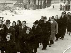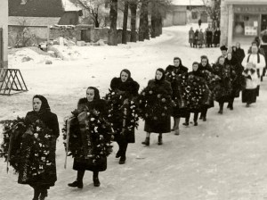 Na prvi sliki na vrhu je spredaj prva v sprevodu Cibova mama, ki tudi nese venec. To je mati Cibovega Jankota. Na tem izrezu je ni videti. Prve nismo prepoznali, druga na levi je Antonija Semič — Štajerjeva mama. Tretja je Gorjupova mama iz pekarne, sledi Pepca Harmel, šesta je Francka Krajc — Tonkova Francka z Male gase in za njo Meri Brence — Malnarjeva Meri. In za ženskami stopata duhovnika. |