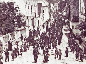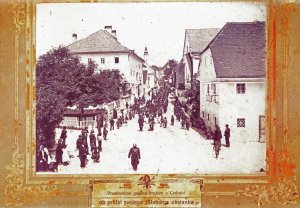 Ne prav preveč gledalcev ob straneh prašne Velike gase opazuje slavnostno parado.Lesena ograja, oziroma lesen plot ograjuje vrt, kjer stoji danes spomenik v drugi svetovni vojni padlim borcem.Kljub vročini so moški po takratni šegi in navadi pokriti s klobukom. Kar se da iz slike razločiti, so ženske oblečene v v oblekah do tal. |