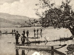 Poleg enostavnih splavov so za prevažanje ob poplavah uporabljali tudi čolne drevake. Na tem izrezu sta kar dva. V vodi je opletena ograja, ki je morda stala ob takratni glavni poti, ki je tekla pod vasjo. Gladina takratne poplavne vode je bila tako visoka, da so se verniki na obisk nedeljske maše v Starem trgu pripeljali na čolnih. Voda je segala do druge stopnice. |