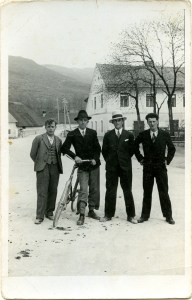 Fantje so se brez strahu glede prometa postavili na prašno makadamsko cesto, na kateri so konjski in kravji dr…. Seveda takrat je bil bicikel dragocen in če si ga imel, potem na sliki nisi mogel brez njega. Za fanti in kolesom je Hrenova hiša, ki je od takrat do danes obdržala skoraj enak videz.