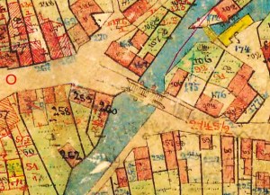Izsek iz katastra (osnovno stanje 1869) kaže območje okrog mosta. Z rdečim krogcem je označeno mesto, kamor se je četvorica postavila fotografu. |
