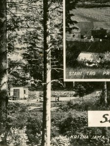 | Nenavadno, da je osrednja točka fotografije stavba, ki stoji pred vhodom v jamo in ne sam vhod. Del slike z vhodom v jamo je prekrit s sredinsko sliko.Križna jama, lepotica med vodnimi jamami, leži le korak pred samim prihodom v našo dolino. Sprva je zaslovela po bogatih najdbiščih kosti jamskih medvedov, kasneje pa je korak za korakom razkrivala svoje vodne rove, očarljive dvorane, predvsem pa neverjetno bogastvo kapnikov.