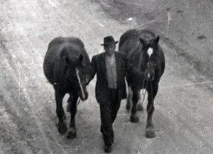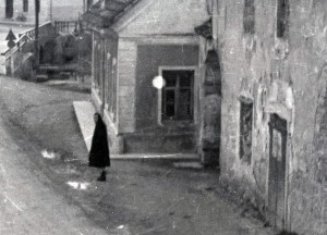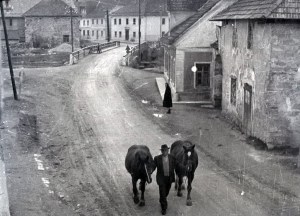 France Mele — Vrbči France je bil nekje s parom konj, morda pri kovaču in se po makadamski cesti vrača domov. Ženska v plašču (kot, da bi bila Korčetova Anica) na drugi strani ceste jih opazuje in si še misli ne, da bo njena prisotnost ohranjena na fotografiji. |