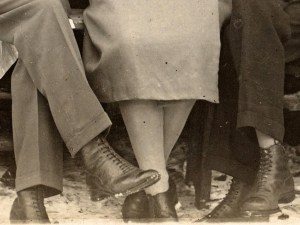 Moške hlače z zavihkom. Temni čevlji z zelo gostim prepletom vezalk – kako zamudno je moralo biti tako obuvanje! Do danes so si izmislili že vsakovrstne olajšave s katerimi tudi pri obuvanju čevljev prihranimo dragoceni čas. |